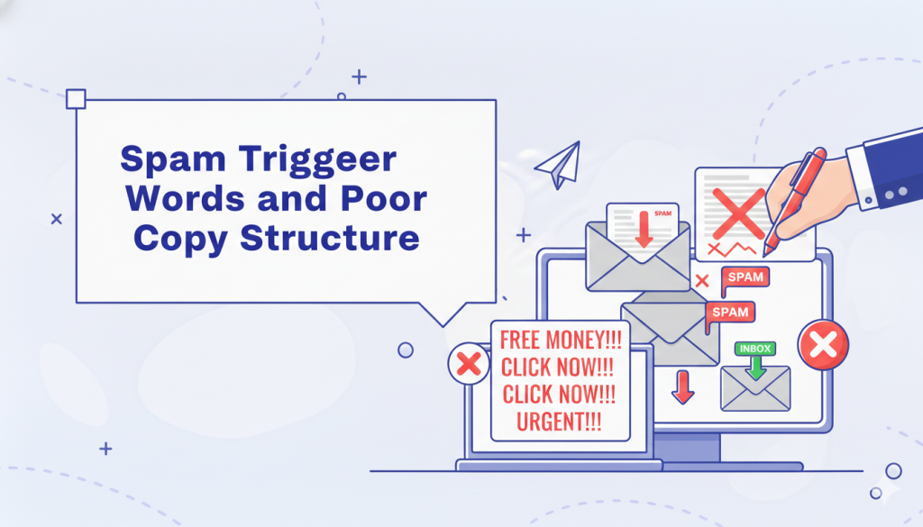 Words like “free,” “guaranteed,” “limited offer,” and excessive links can push emails to spam. Poor formatting, large images, and HTML-heavy emails also increase risk.